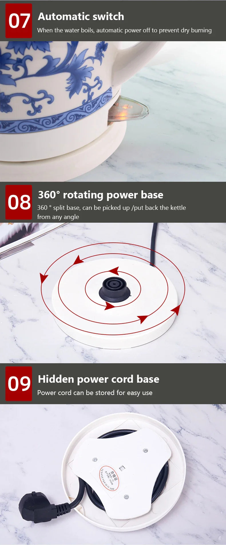 SPECIFICATIONSAutomatic Shut-off: YESBrand Name: CUKYICapacity: 1L,1.2L//1.5LCertification: ce,CCCFeature: 360 Degree Rotational BaseFunction: Safety Auto-Off Function,Overheat Protection,Anti-dry Protection,Water level indicationHeating Method: Underpan... Read more