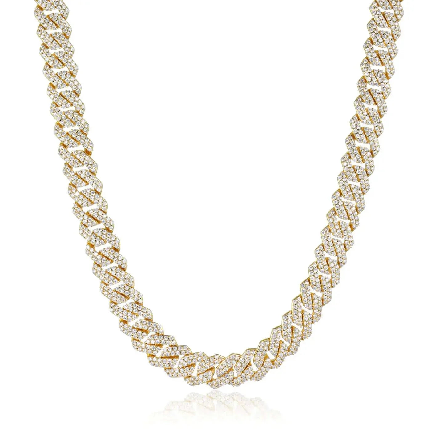 Tyresse's 12mm iced prong cuban link chain is crafted from gold plated brass and completed with precision-set cubic zirconia, designed... Read more