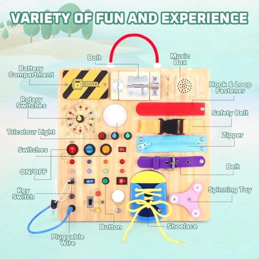 23 in 1 Busy Board Montessori Toys from 1 year Activity Board Wooden Toy With 15 Switches, 26 LED Lights, Motor Skills Toy for 1 2 3 year old boys and girls