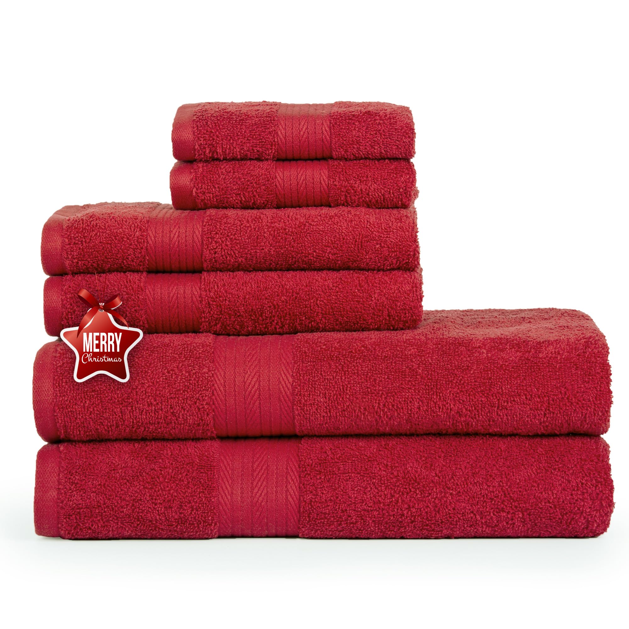 Ample Decor 100% Cotton Luxury Towel Set, Soft & Absorbent 6-Piece Set ? 2 Bath Towels, 2 Hand Towels, 2 Wash Cloths for Bathroom ? Christmas Red