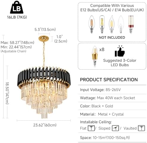 AOOCHOK Black and Gold Crystal Chandelier Pendant Light, Round Modern Crystal Chandelier for Dining Room, Living Room, Bedroom, Restaurant, E14 x 8, Φ60cm