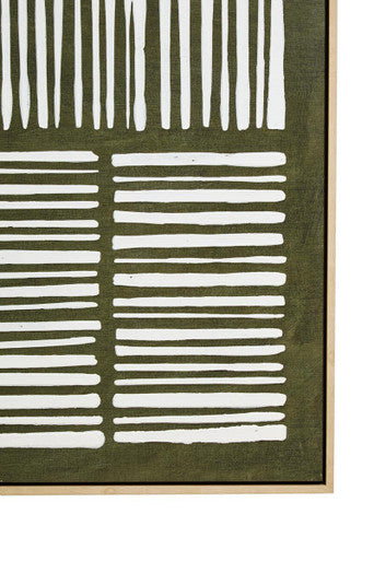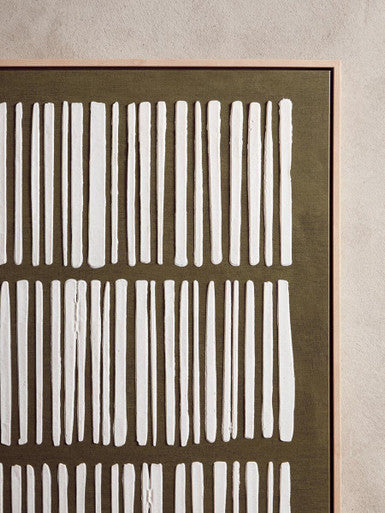 - Centre above a sofa; echo greens with plants or cushions.