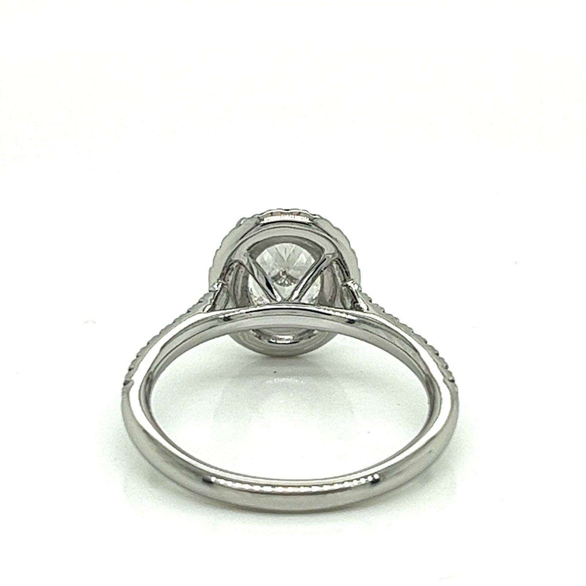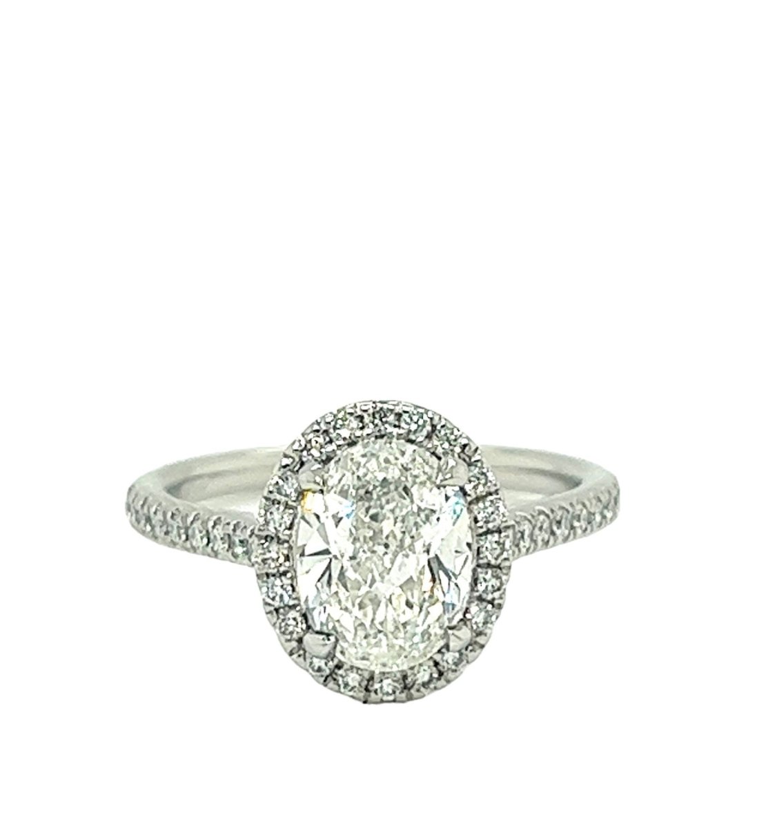 Oval diamond halo ring. Available with 0.50ct 0.75ct 1.00ct 1.50ct & 2.00ct centre diamonds. One shown is 1.50ct. Available in platinum and 18ct gold from £2250 for 0.50ct centre. Item shown is for 0.50ct centre