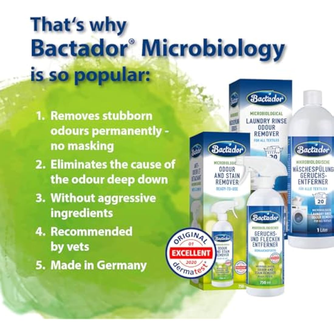 Bactador Odor and Stain Remover Concentrate 5L - Biological enzyme cleaner against sweat, smoke, cat urine, dog urine, animal odors - For household, car & animal environment