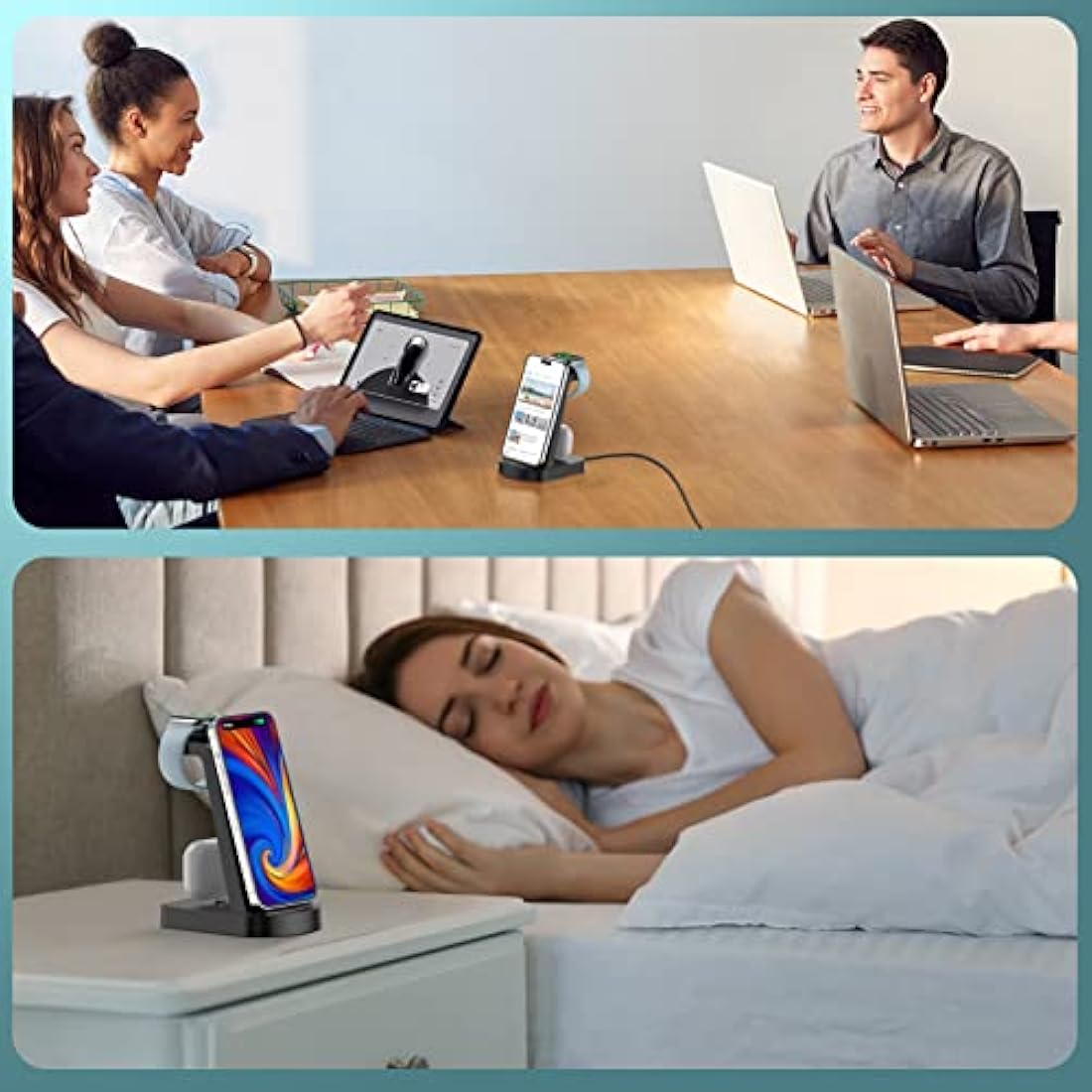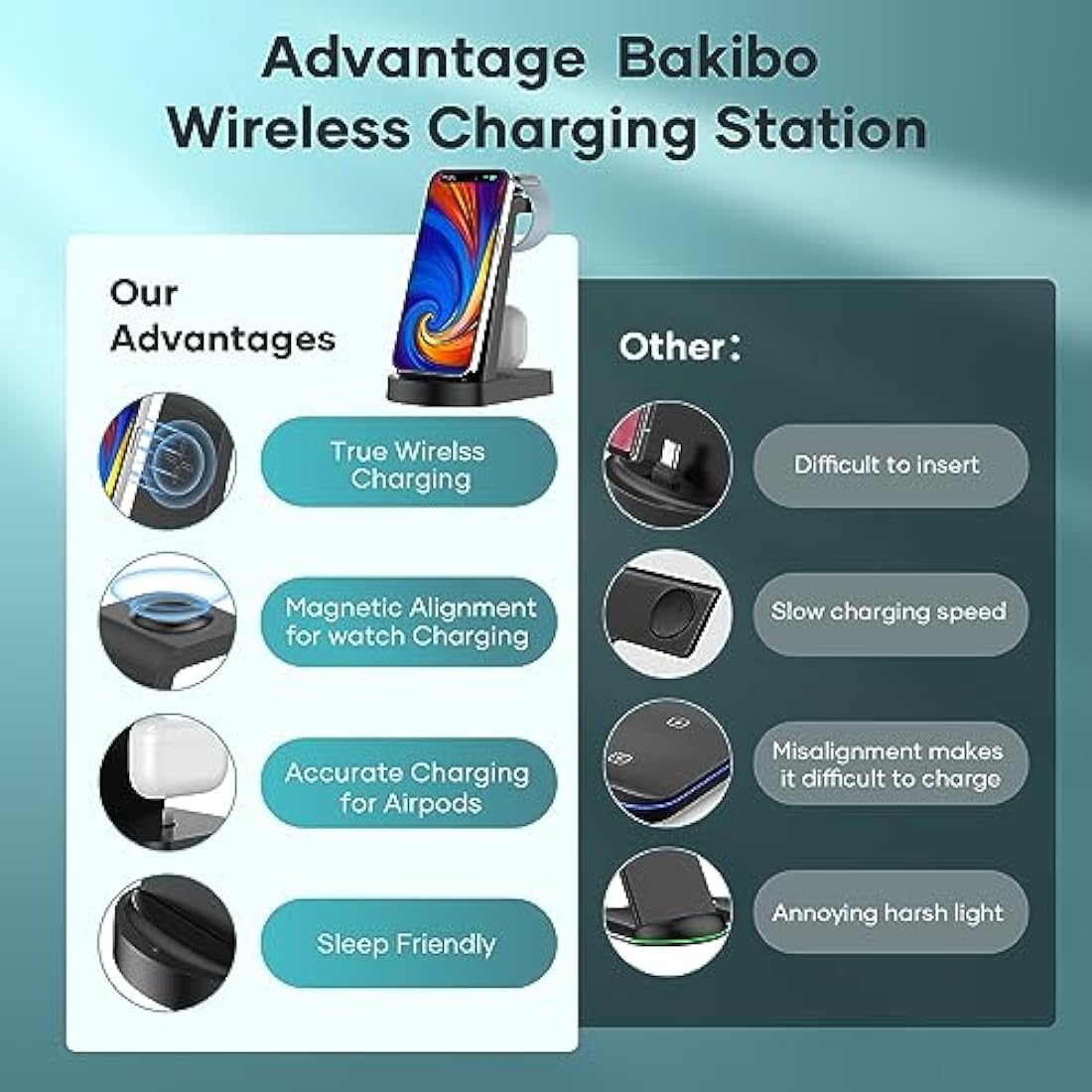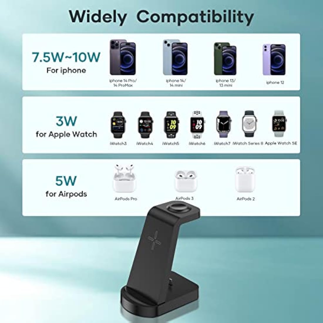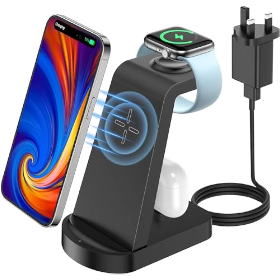 【Wireless Charger 3 in 1】The Apple Charging Station makes wireless charging easier,provide fast wireless charging up to 18W. The Charging Station can charge your iPhone and others QI charging phone, Apple watch and Airpords separately or at the same time. Apple watch charger Perfect magnetic alignment experience for Apple Watch. Best choice for Apple users. 【Universal Compatibility】The 3 in 1 charging station compatible with iPhone 14/14Pro/14 Pro max/13/13Pro/13Pro Max/13 mini/12/12Pro/12Pro Max/12 mini/11/11Pro/11Pro Max/XS/XR/XS MAX/X/8/8Plus/7/6, Apple iWatch 8/7/6/5/4/3/2/1/SE and AirPods 1/2/3/Pro1/Pro2. Just place your devices on the 3 in 1 charger,then Stable and efficient charging begins 【Fast Charging and Safety】The wireless charging station output up to 7.5W~10W for your iPhone smartphone, 3W for Airpods and 5W for Apple watch when used with the QC 3.0 18W adapter included in the package. The charging station for Apple devices equipped with heat dissipation holes providing multi-protection as over-temperature protection, over-voltage protection, short circuit protection, over-current protection for safe. 【Simplify Your Life and Space-Saving】The iPhone charging station Charge your phone without removing the case(thick recommended≤0.2in).The wireless charger iPhone takes up less space and will instantly tidy up your cluttered desk,make your life more elegan. Best choice for organise your office, bedroom, study, hall or desk. 【What You Get and Best Gift】The package includes 1* charger station, 1* QC 3.0 18W fast charger, 1* USB-C charging cable, 1*user manual, 24 months warranty.The Apple wireless charger is best gifts for men women boyfriend girlfriend, Valentine's Day,Father's Day, Mother's Day, Birthday, Anniversary, Thanksgiving Day and Christmas.