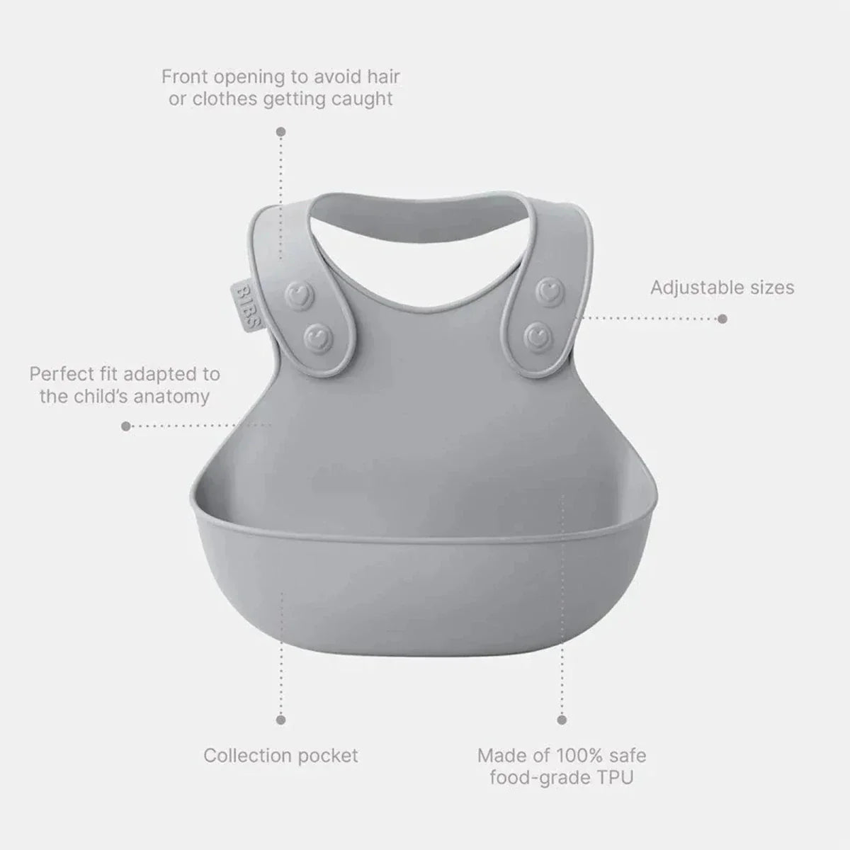 BIBS Dinner Bib combines a functional design with a stylish look to make mealtimes more comfortable and practical. Made from soft yet durable food-grade material, it is resistant to oil, colours and food stains, while the front pocket helps catch spills to keep clothing clean. Its ergonomic shape supports freedom of movement, and the easy-to-clean surface offers everyday convenience for parents, making it a safe and comfortable feeding bib for little ones.