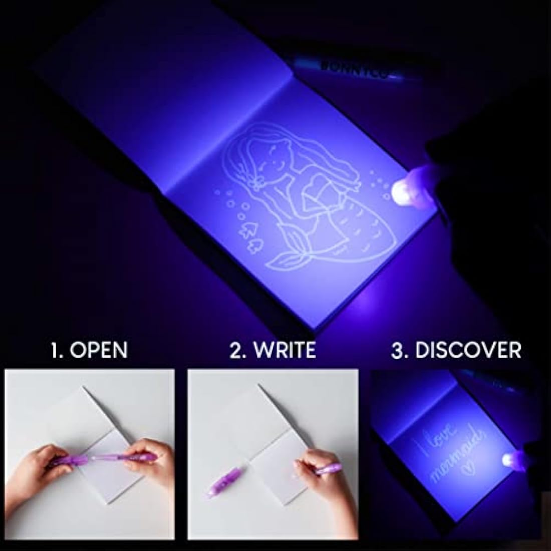 🧜♀️ PACK 32 MERMAID 🧜♀️ Top Secret Pack Mermaids contains 32 sets of an invisible ink pen UV light (batteries included) and a small notepad with fun 3.3x3.8 in drawings of mermaids. There are a total of 32 magic pens in 4 different colours: lilac (x8), pink (x8), blue (x8) and green (x8). Clear ink is the same colour in each 🧜♀️ SUPER FUNNY 🧜♀️ The spy pens for girls and boys can be used to write secret phrases or drawings in the notebooks, which can only be discovered by shining the pen’s ultraviolet light on them. Ideal as gifts to give to guests or as mermaid party decorations girl. Very cheap mermaid party bags filler for children to impress boys and girls 🧜♀️ SAFE TOY WITH CERTIFICATE 🧜♀️ Product safe for use by children over 3 years. Its ink is non-toxic and can be used on paper, fabrics, walls ... even on the skin. Children will love to paint themselves! Party favours for girls, under the sea party decorations 🧜♀️ PARTY BAG FILLERS FOR GIRLS AND BOYS 🧜♀️ Each set of UV spy pen and notepad comes in a single bag with zip close, making them perfect as party gifts for children's birthdays, mermaid pinata filling, school rewards, Christmas parties, advent calendars and other events. They are ideal for party games for kids birthday as they will bring a lot of fun 🧜♀️ MOMENTS OF CREATIVITY 🧜♀️ Pack of invisible pen and notebook is ideal as mermaids birthday gifts for school girls and boys 3, 4, 5, 6, 7, 8, 9, 10, 11 and 12 years old and will provide many moments of creativity and fun. You can play games like escape room, looking for the treasure, riddles, detective games, or design skin tattoos ... Children will have a great time for hours with these novelty toys!