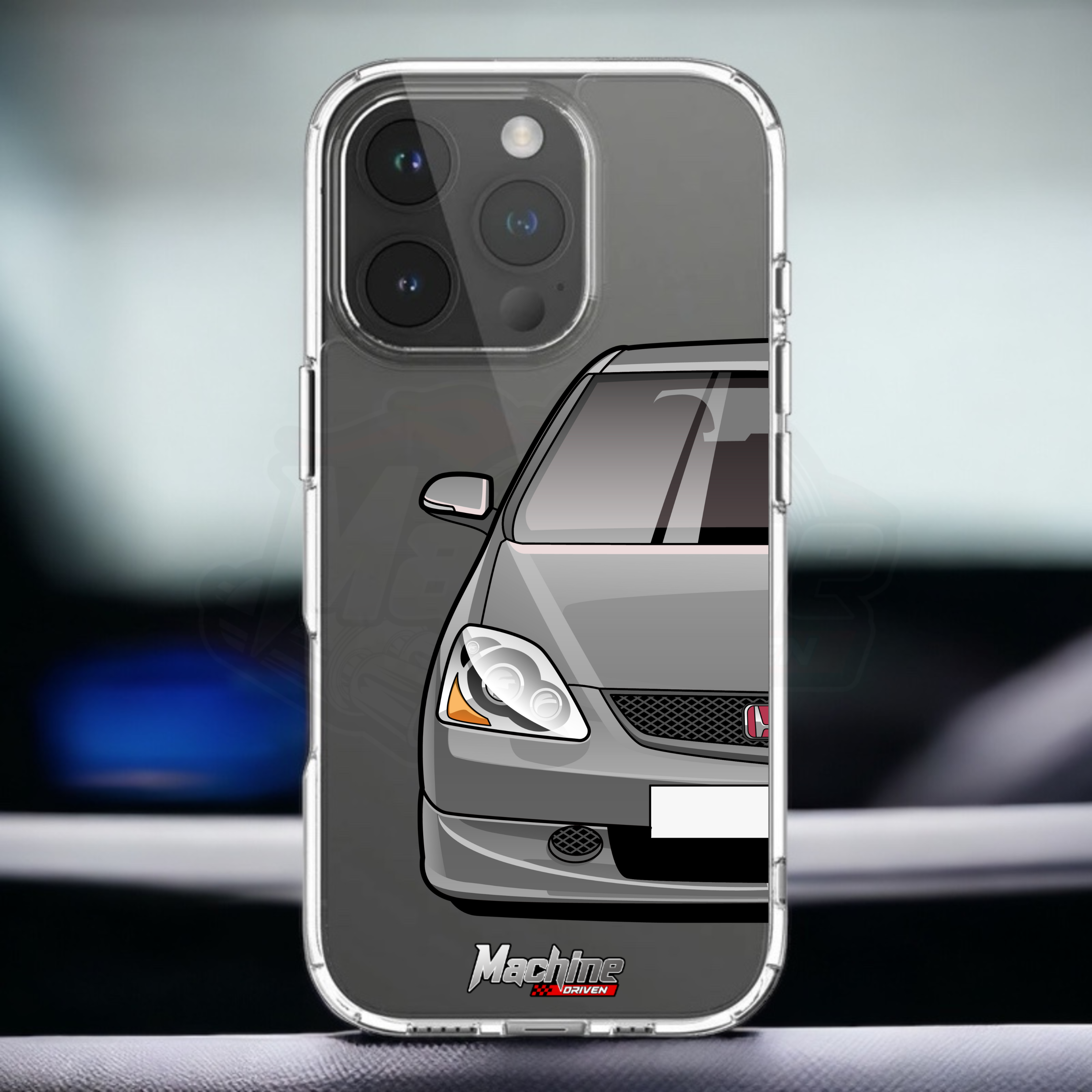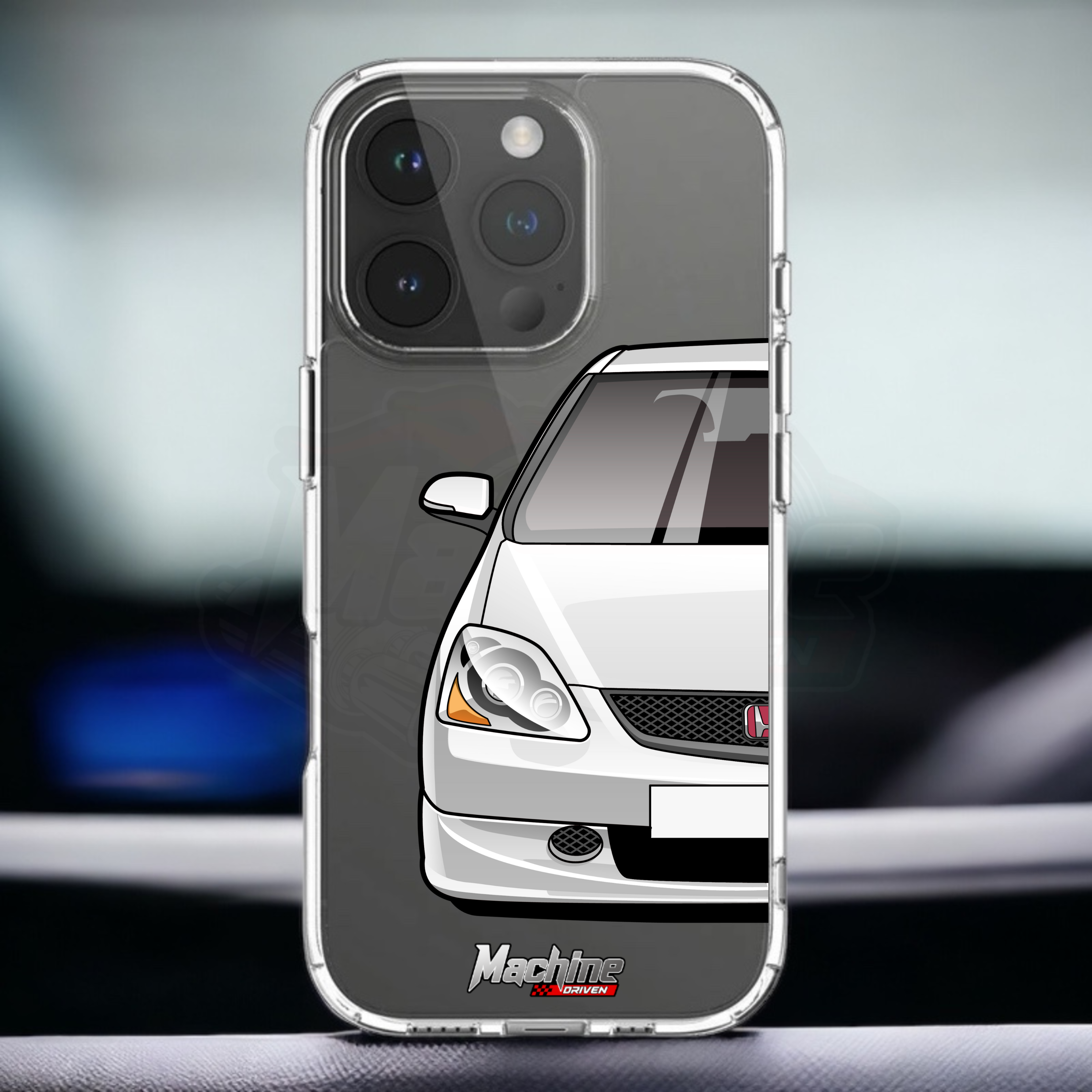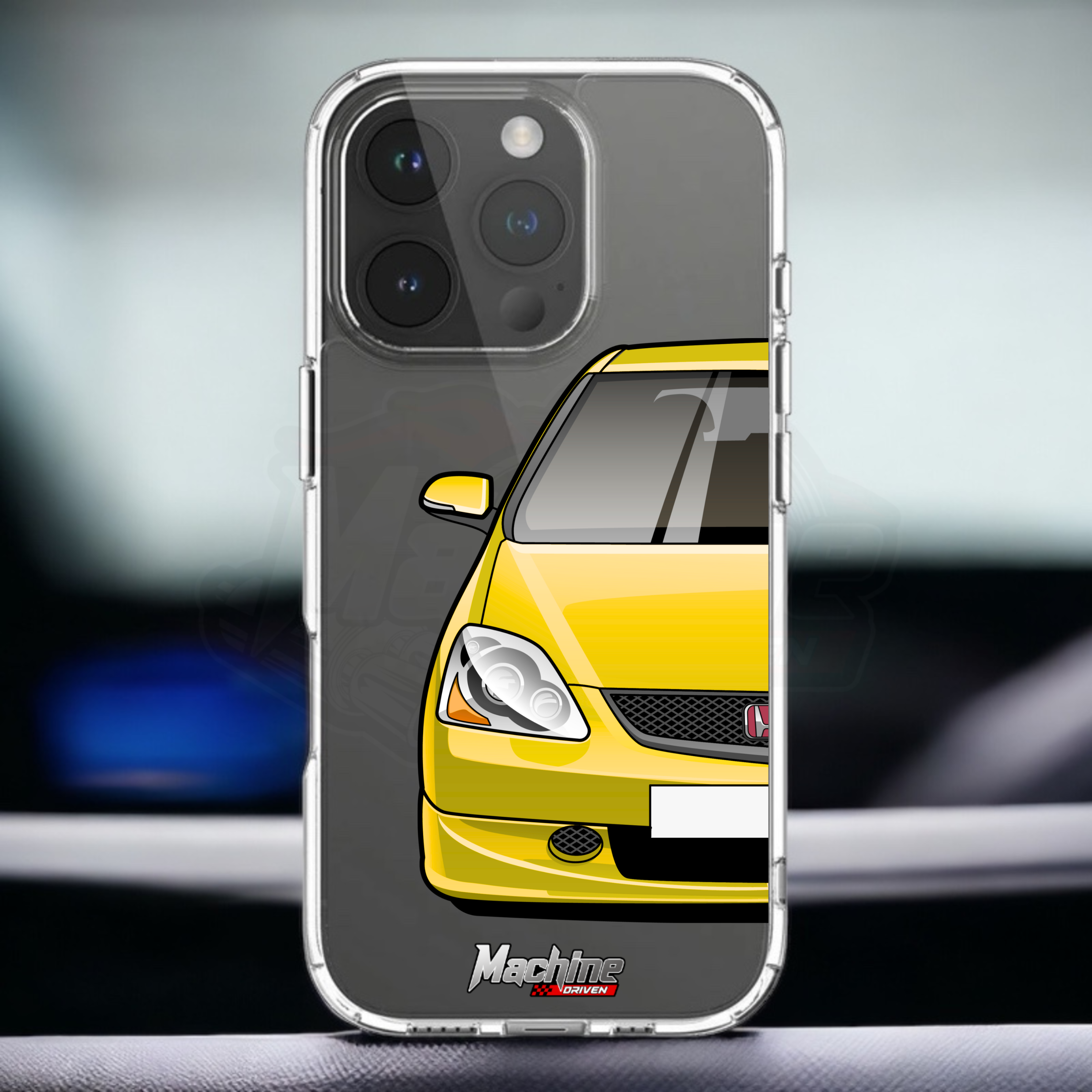 Our phone cases are transparent to show off the original colour of your phone, overlayed with ultra realistic half-image of your car and Machine Driven Logo.