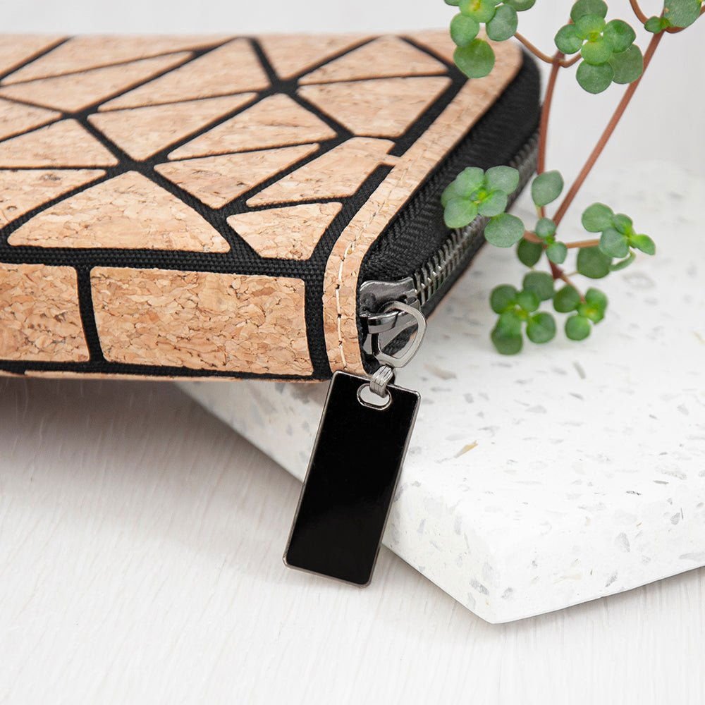 Discover the perfect blend of style and sustainability with our Cork Geometric Zip Wallet. This wallet is not just an accessory; it's a statement piece that reflects your commitment to the environment while keeping you chic and organised. Crafted from eco-friendly cork, this wallet stands out as a cruelty-free alternative to traditional leather, ensuring that you look good while doing good.