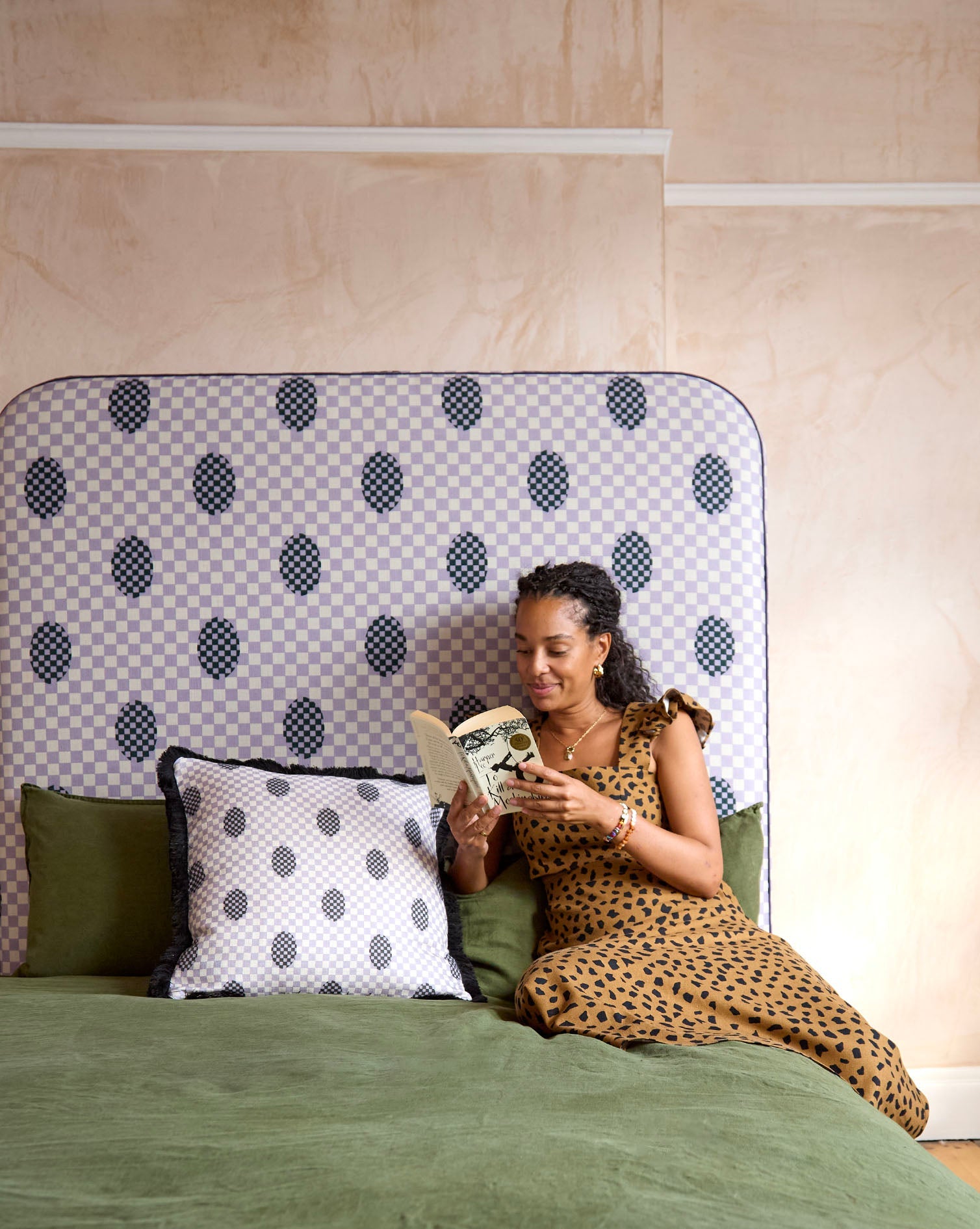 Curved Piped Headboard - Deco Checkers in Violet Veils - Micaela Sharp Collaboration