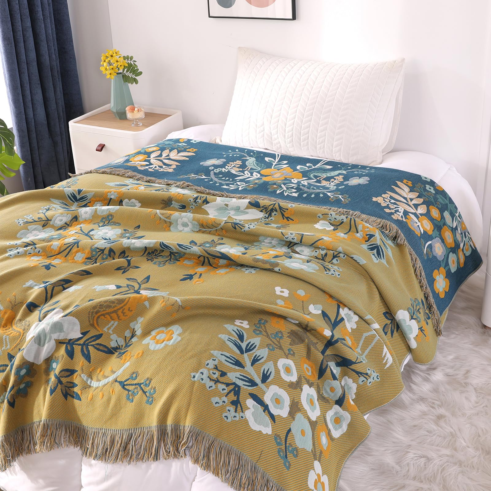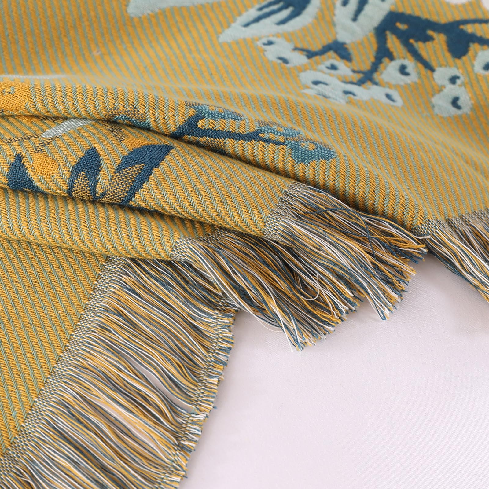 DECMAY Double-sided Throws for Sofas Large, Boho Sofa Bedspread Throw Blanket with Tassels, 100% Cotton Throw for Sofas, Bed and Armchair, Olive,