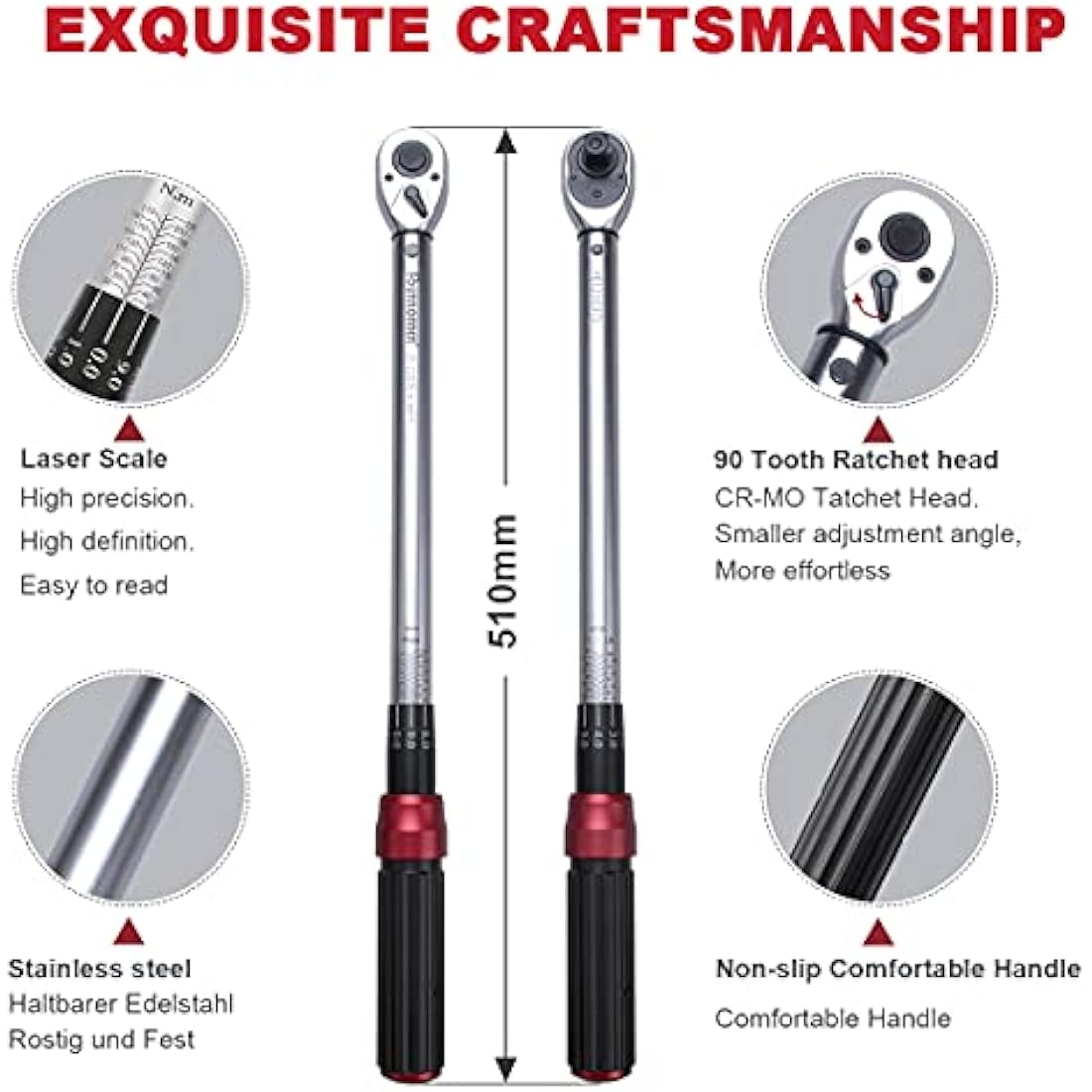 FOURROBBER Torque Wrench Set 1/2-inch Drive Click Bicycle Torque Wrench Dual-Direction Adjustable 90-Tooth Torque Wrench with Buckle 20-220Nm,Accuracy ± 3% Visit The Store