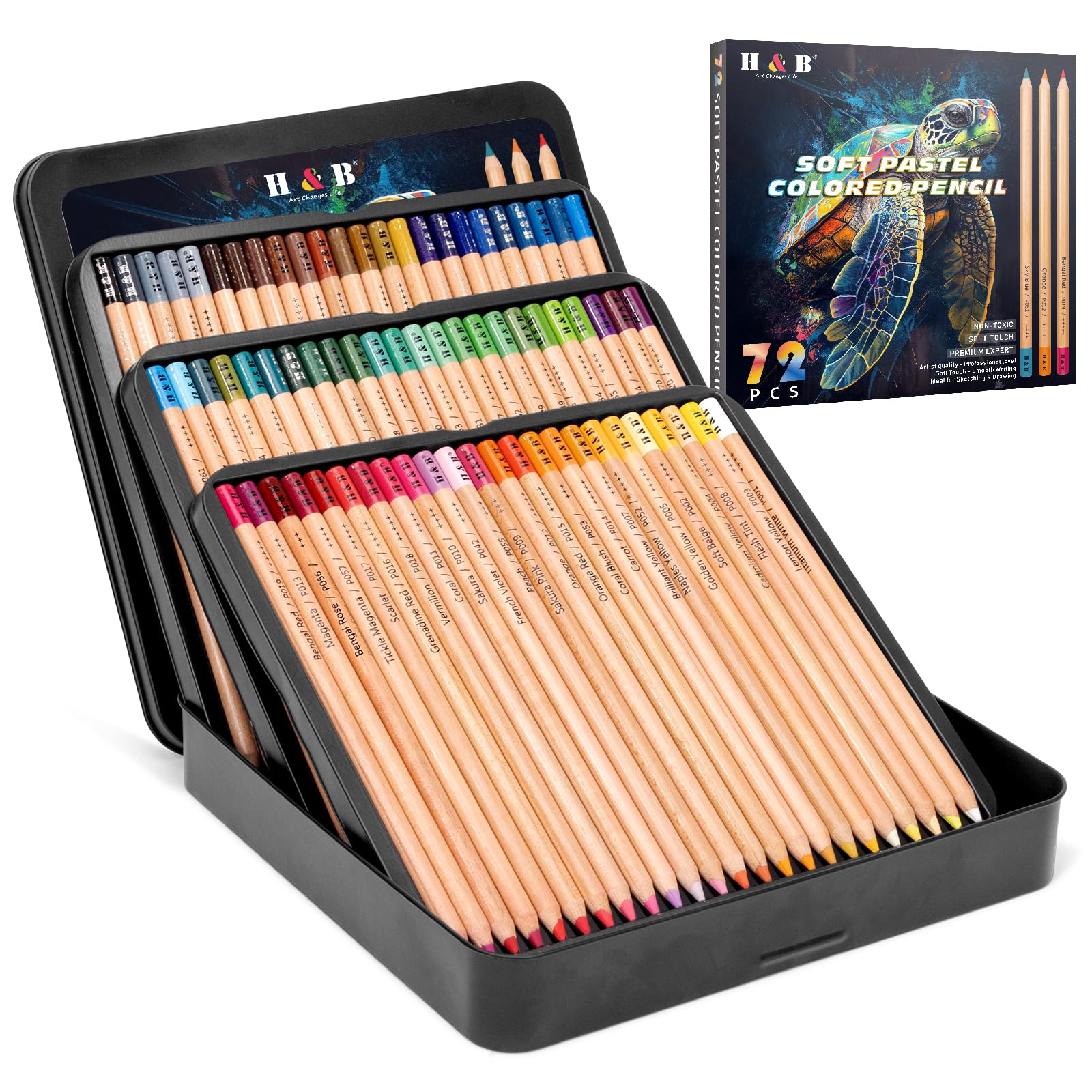 H & B Pastel Colouring Pencils, 72-Count in Tin - Professional Artist Pencils for Adults & Kids,Vibrant for Sketching,Blending, Colouring Books, Wet