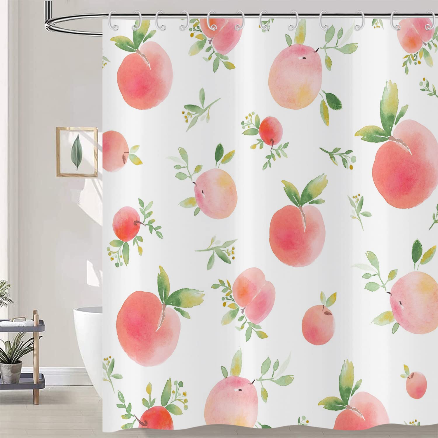 Hnmdmyi Pink Peach Shower Curtain 180x200, Cute Fruits Green Leaf Shower Curtains Watercolor Art Painting Aesthetic Bathroom Curtains with Hooks