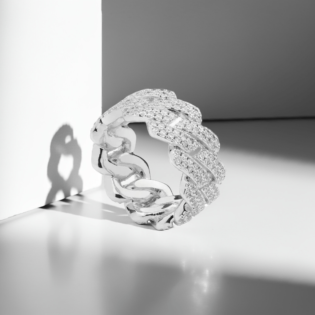 This luxurious Men's Silver Iced Prong Cuban Ring is crafted with authentic 925 Sterling Silver, is hand-finished with prong cuban links and completed with handset cubic zirconia, designed to shine. Coordinate with the matching prong cuban chain and bracelet.