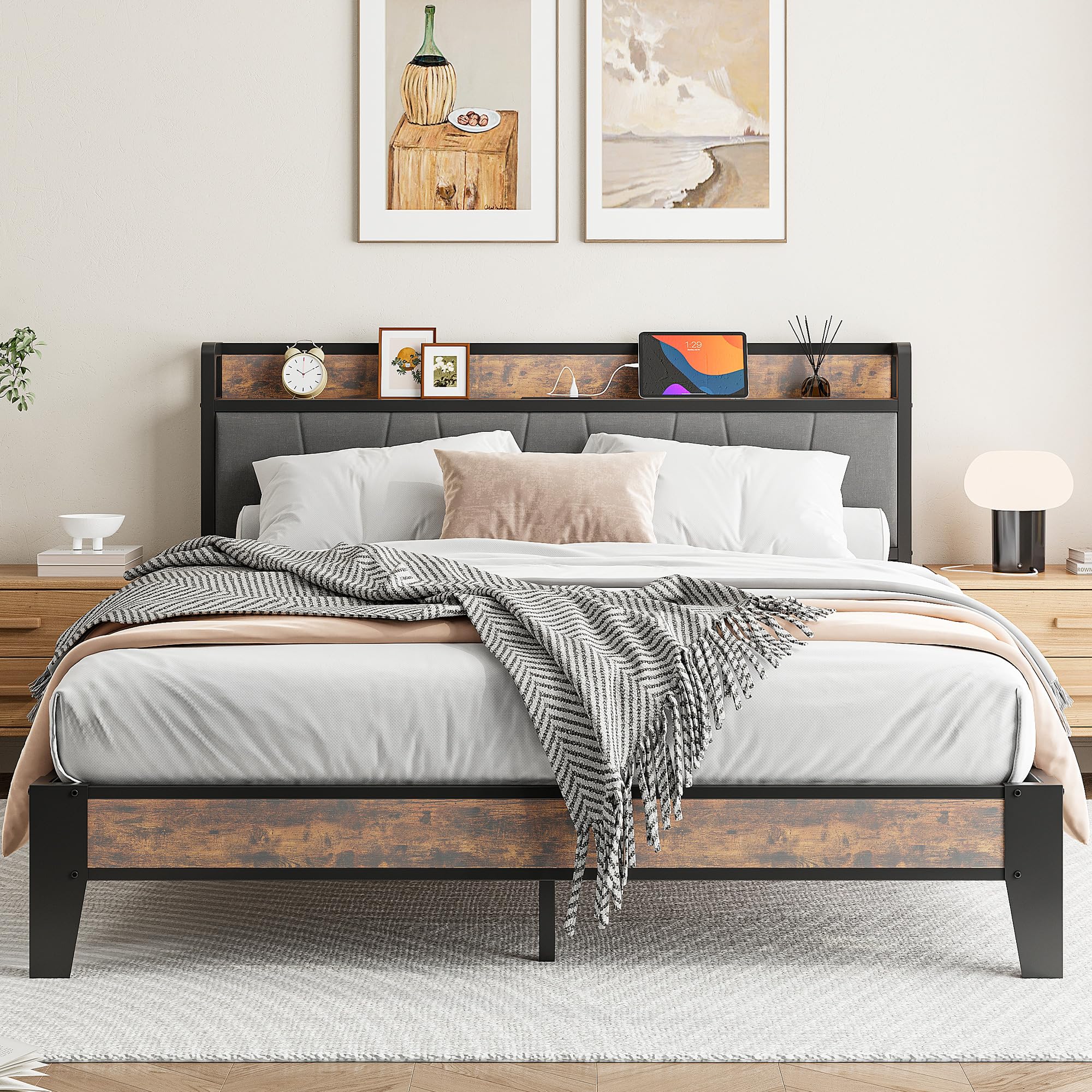 IRONCK King Size Bed Frame with Storage Shelf Upholstered Headboard, Platform Bed Frame with Charging Station, Metal Bed Frame/UnderBed Storage,
