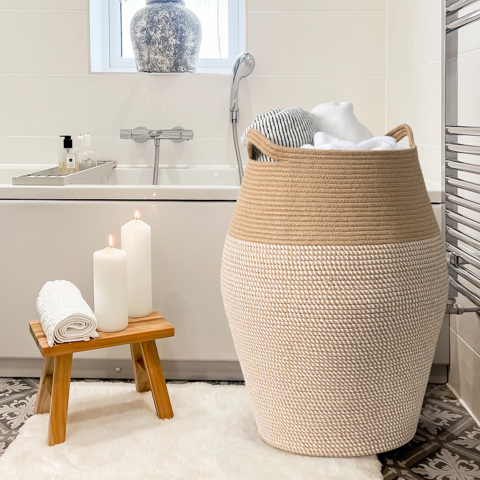 Laundry Hamper Tall Woven Cotton Rope Laundry Basket Dirty Clothes Hamper Kids Curve Laundry Basket Large in Bathroom Laundry Room for Dirty Clothes