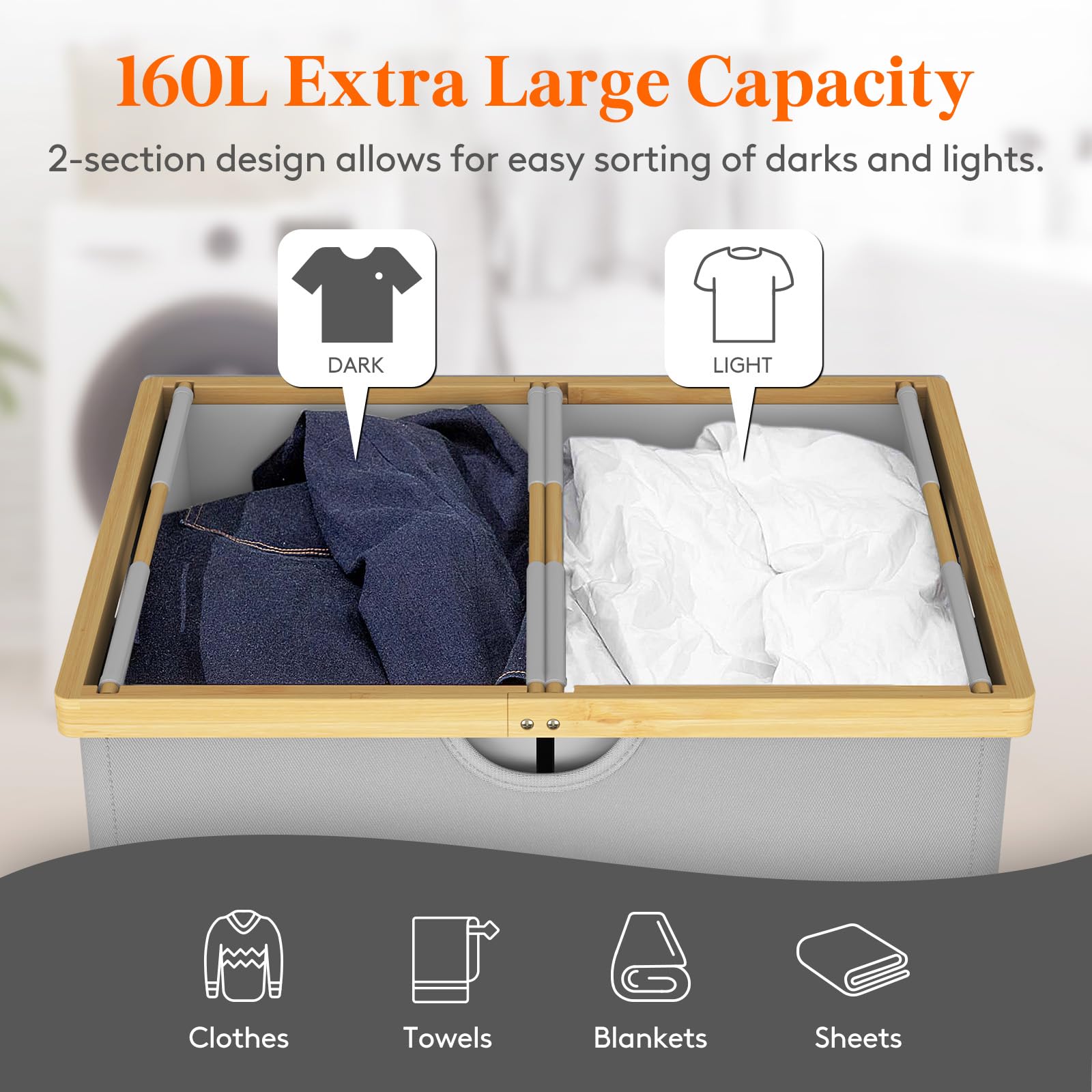 Lifewit 160L Double Laundry Hamper with Lid, Extra Large Bamboo Laundry Basket Dirty Clothes Hamper, 2 Section Laundry Bin Organizer for Laundry Room