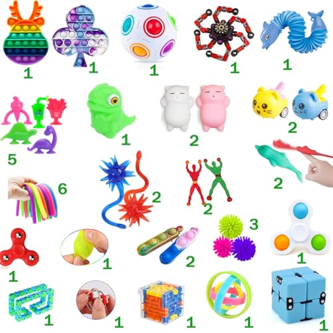 Super Value Fidget Pack: A varied selection of Lubibi sensory fidget toys including Push PopPop Bubble*2,Simple Sensory toy*3,Suctioning pleasure*5, Mochi squeeze toy*2, Rainbow Ball Magic Cube*1, Wacky Track*1, Flippy Bike Chain*1, Catapult animal*2,Popper*1,Stretchy strings*6, Fidget Spinner*1, Dolphin telescopic tube*1,Pull back car*2,Magic circle*1,Marble mesh toys*3,Meteor hammer*2,Sticky toy *5,Monkey Strings ball*3,Top*1,Maze*1,Infinity Cube*1. Safety is a top priority at Lubibi: We exclusively use the highest quality materials. Our products undergo rigorous factory testing and hold CE certification, ensuring they are safe for both kids and adults. Enjoy worry-free playtime with our fidget toys. Perfect Relieve Stress and Anxiety Toy: the Lubibi Fidget Bundle serves as the perfect tool for relieving stress and anxiety in teens and Kids. Crafted with great design to address concerns such as anxiety, focusing issues, ADHD, ADD, autism, OCD, and breaking bad habits. Engage in stress relief, enhance focus, and boost attention by simply squeezing, stretching, and flipping these fidget toys. Amazing Gift And Reward: Our Lubibi Fidget Box makes an amazing gift or reward for various occasions. Ideal for kids' birthday party favors, school classroom rewards, treasure boxes, carnival prizes, pinata fillers, Christmas stocking stuffers, Christmas giveaways, goodie bag fillers, miniature novelty toys, and Halloween party giveaways. Satisfaction Service: Customer satisfaction is paramount to us. When you choose our sensory fidget toys, rest assured that you will receive excellent customer service. For any queries, concerns, or service needs related to your purchase, feel free to contact us. We are committed to providing friendly and efficient customer support.
