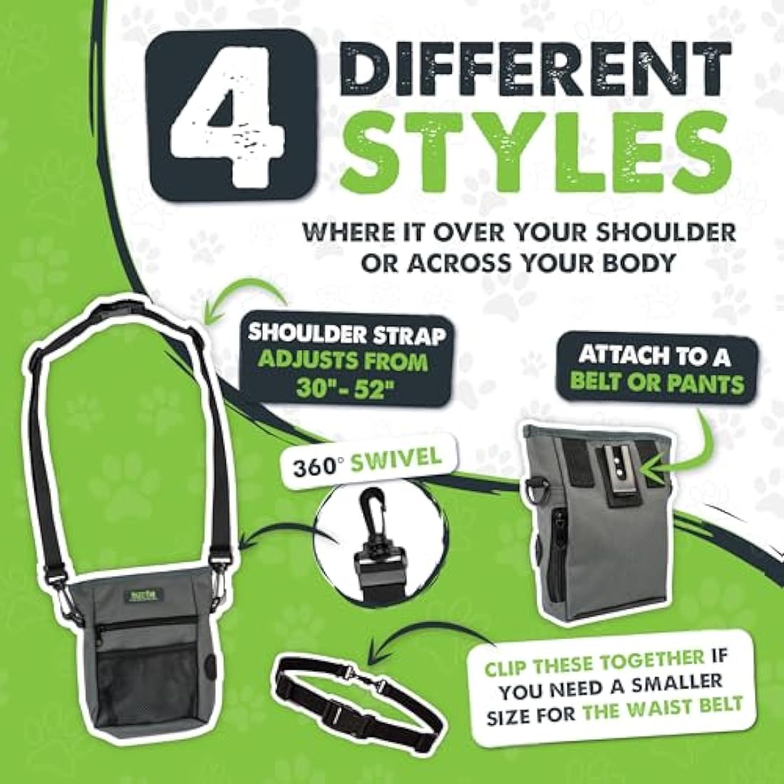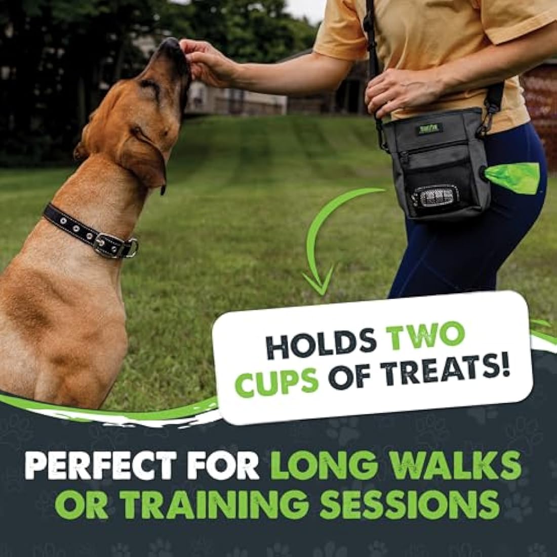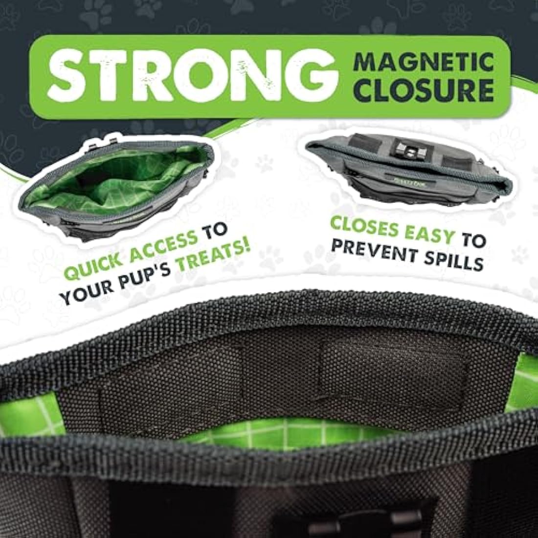 Mighty Paw Dog Treat Pouch 2.0 | Pet Training Hands-Free Snack Bag w/Strap. Holds 2 Cups Kibble, Phone & Keys. Magnetic Clasp & Waist Belt Clip. Includes 1 Roll of Poop Bags (Green/Grey)