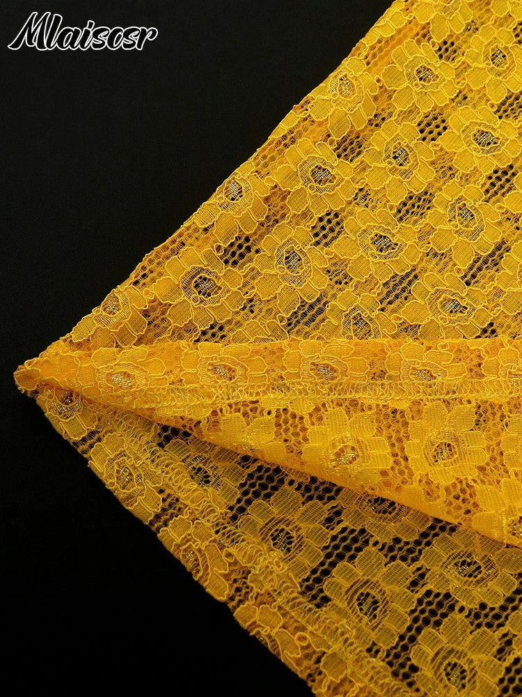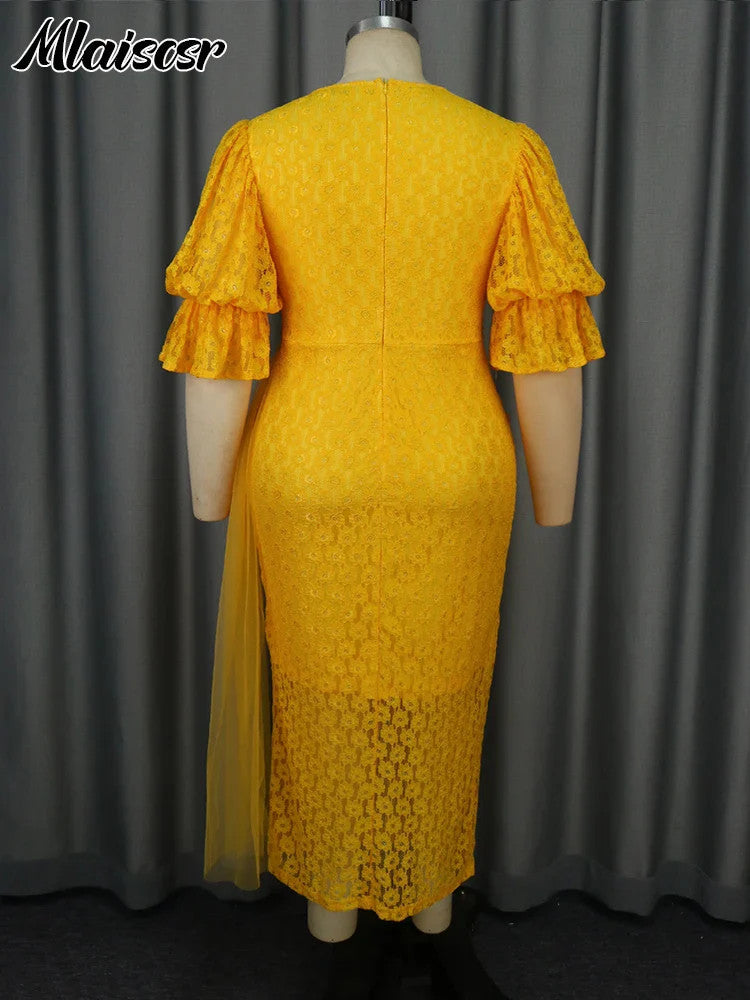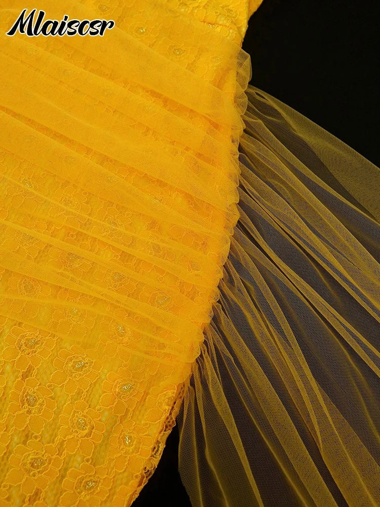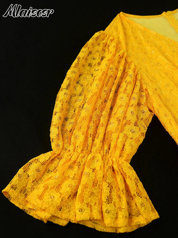 Mlaiscsr Yellow Birthday Prom Floral Lace Puff Sleeve See-Through Midi Dresses
