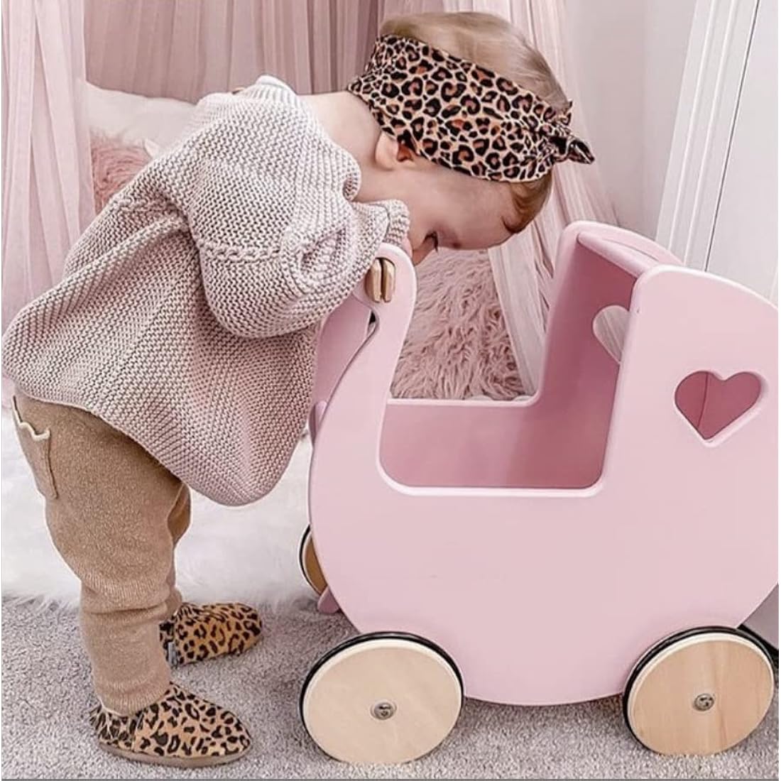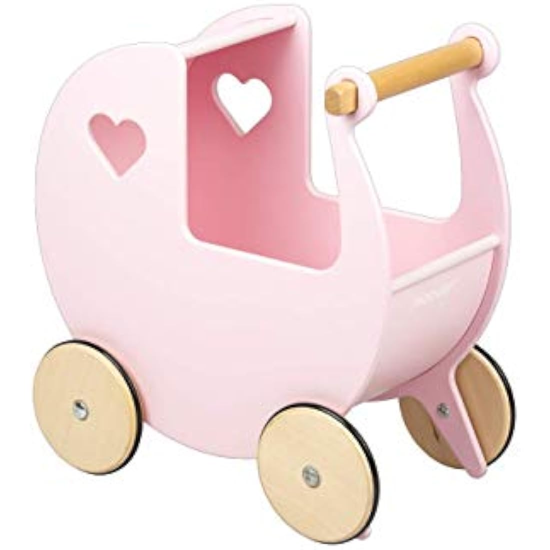 Moover Classic Doll's Pram for Toddlers, Fully Assembled, Designed in Denmark from Russian Birch Plywood, Push Along Toy, 18 Months+, 44 x 43 x 24 cm, Baby Pink and Natural Wood