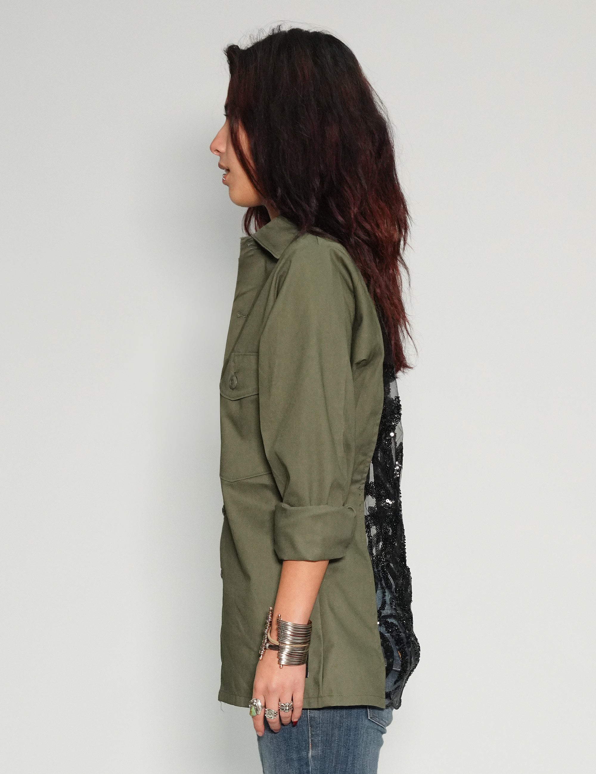 Vintage US Army khaki long sleeve shirt customised with black sequin, art-deco style sheer back panel. Features two button-fastened breast... Read more