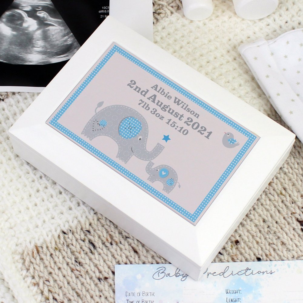 Discover the Charm of the Personalised Blue Baby Elephant White Wooden Keepsake Box