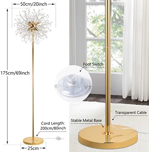 ❤【Ideal Crystal Floor Lamps】This floor lamp is made up of dense crystal branches and golden-finish metal, showing a modern, elegant, romantic and gorgeous style. 8 lamp holders design can meet your needs for lighting, which is very suitable for illuminating large spaces. It is an ideal floor lamp for living room and bedroom. ❤【Lamp Size & Installation】This 170cm tall floor lamp is simple and quick to instal; Equipped with an 200cm power cord so that you can move the standing lamp to any place, such as by the sofa or corner; Besides, this floor lamp adopts a foot switch design, which is simple and convenient to operate. ❤【CE Standard & G9 Sockets】This dandelion firework floor lamp is equipped with 8 * G9 sockets, Compatible Types: LED, Halogen, CFL(Max 10W, Bulb Not Included). Equipped with necessary accessories and detailed instructions, Simple and quick installation! All sockets, switches and wires have passed CE safety certification, please rest assured to use! ❤【Suitable For Many Occasions】Our crystal floor lamp has a beautiful appearance, which can blend with your home style. The pole is straight and tightly connect with the base, No swing. Stable metal base guarantees home safety and is suitable for installing floor lamps in living rooms, bedroom, dining room, behind sofa or corner. ❤【Risk-free Shopping & After-sales】Rayofly Lighting Fixture promises to provide each customer with 2 years of parts replacement service. Committed to providing you with the most comprehensive service, whether it is installation problems or replacement parts, please feel free to contact us, we will definitely ask you to provide you with the best solution!