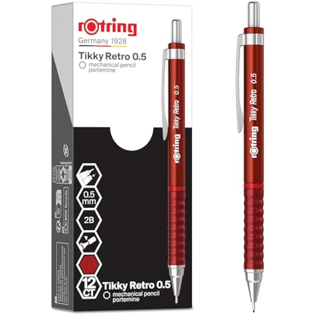 rOtring Tikky Retro Mechanical Pencils | 2B 0.5 mm | Red Barrels | with Comfort Rippled Grip | 12 Count