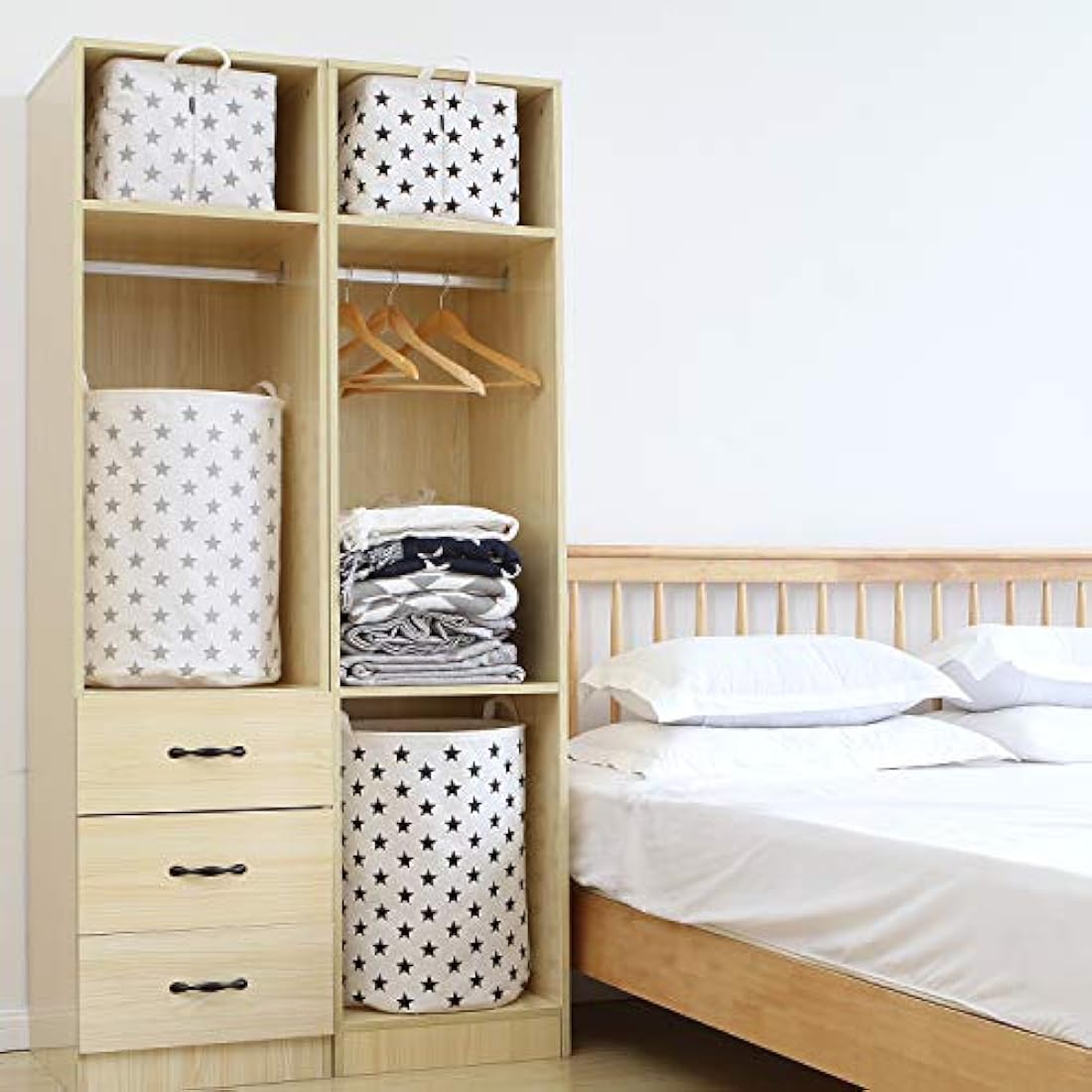 Sea Team 19.7 Inch Large Sized Waterproof Coating Ramie Cotton Fabric Folding Laundry Hamper Bucket Cylindric Burlap Canvas Storage Basket with Stylish Grey Stars Design