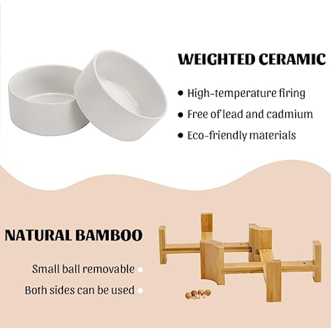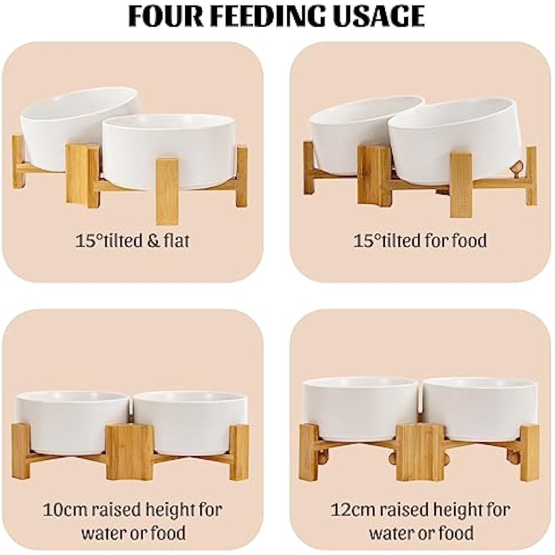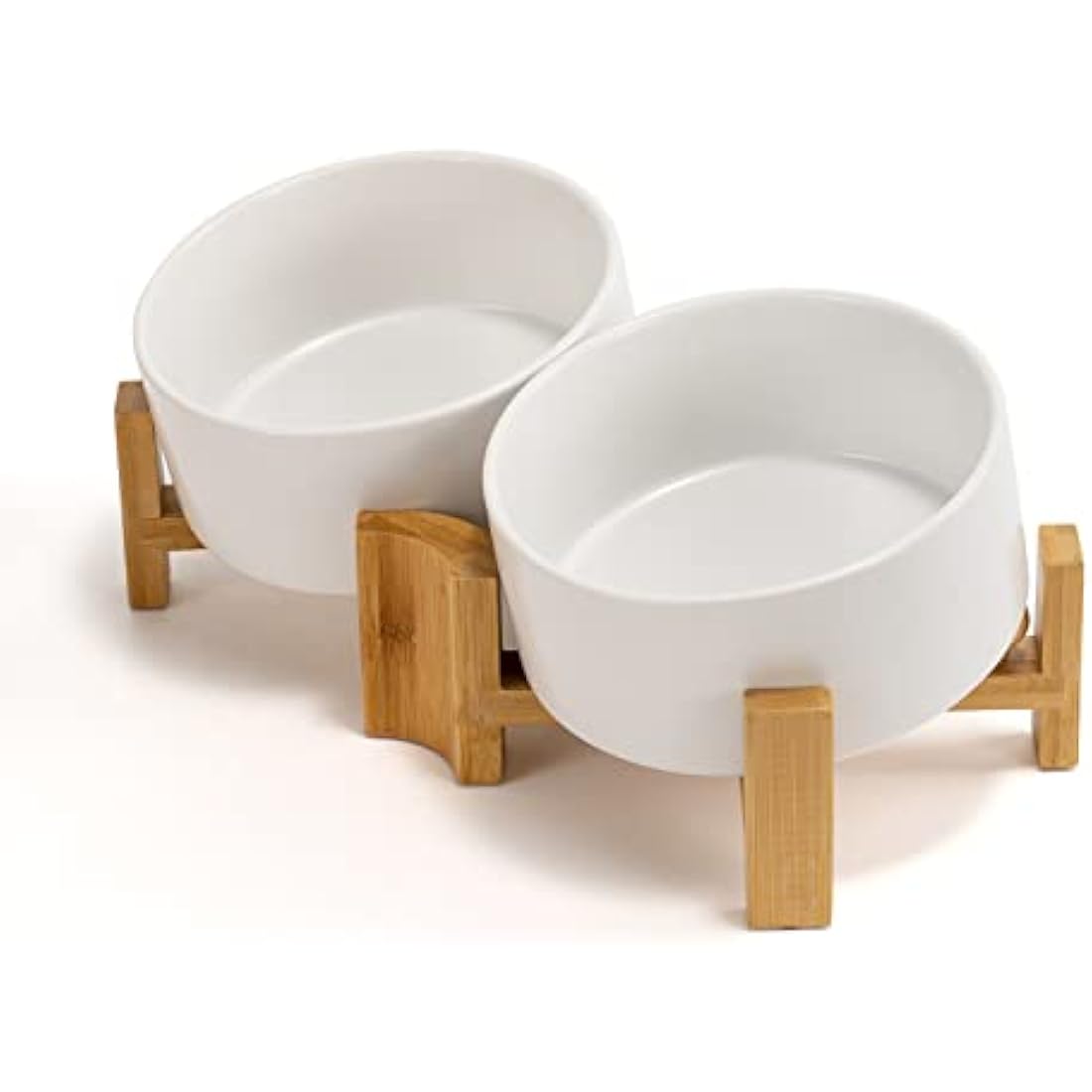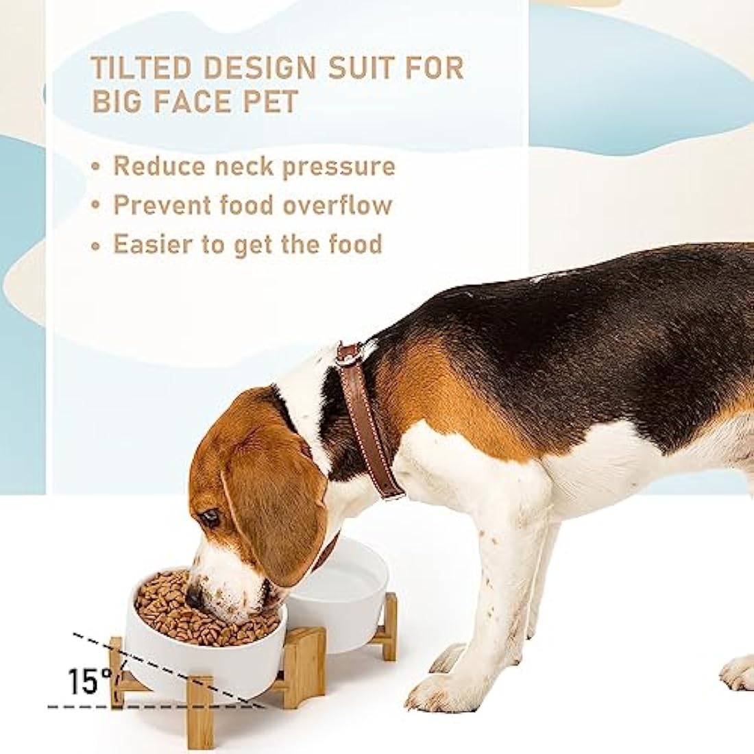 SPUNKYJUNKY 15° Slanted Ceramic Dog and Cat Bowl with Wooden Stand, Tilted Bulldog Food and Water Bowl No Slip Non-Spill for Cats Medium Dogs Flat Face Pets (850ml, White × 2)