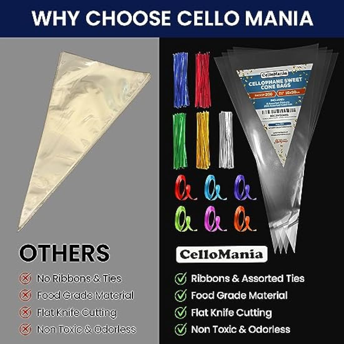 Sweet Cone Bags with Twist Ties and Ribbons, 100Pcs Cellophane Crystal Clear Sweet bags, Triangle Sweet Party Cones Bags Perfect for Halloween, Christmas and many more (16x30cm - Pack of 200)