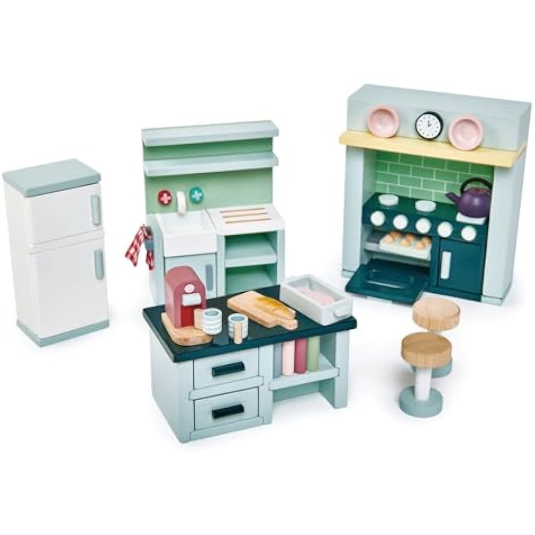 Tender Leaf Toys Dolls House Kitchen Furniture - Wooden Kitchen Furniture with Aga, Sink Unit, Fridge and Island Unit for Dolls 10-12cm Tall