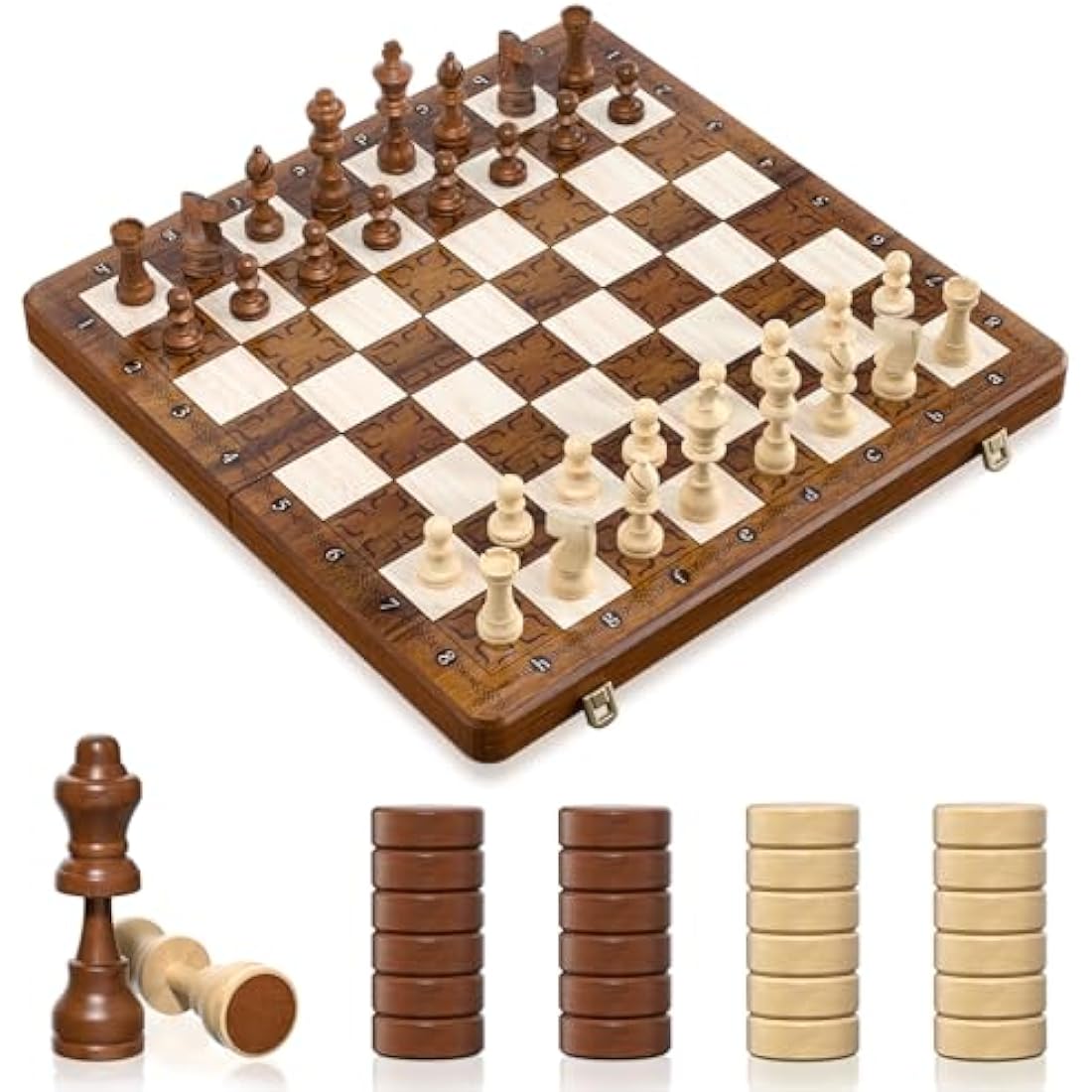Tumu 2 in 1 Chess Set for Adults Kids - 16 Inch Magnetic Wooden Chess Board with Checkers, 2 Extra Queens, Folding Travel Chess Set with Storage Slots, Gift Toys for Boys Girls