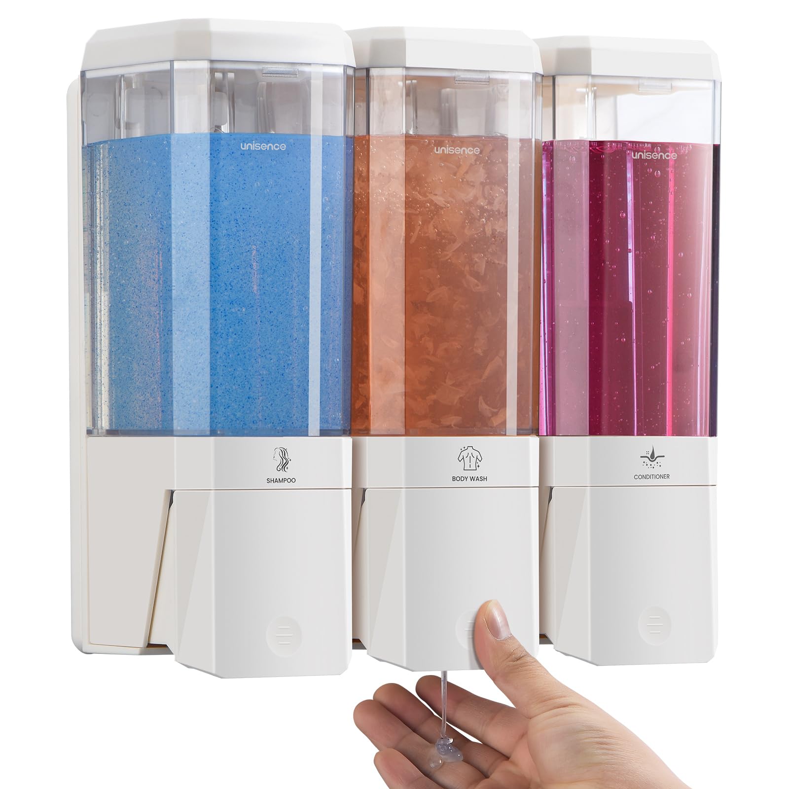 Unisence 3-Chamber Wall Mounted Shower Dispenser - No Drill Soap and Shampoo Dispenser for Bathroom and Hotel - Large Capacity 3 x 500ML, White