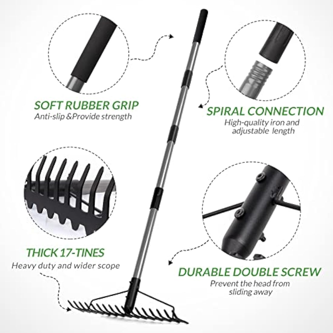 Walensee 165cm/5.4FT Heavy Duty Garden Rake with Stainless Steel Handle, 17 Steel Tines Metal Dual-Head Garden Rake Tool, for Loosening Soil Gathering Leaf Leveling Lawn Farming Land Yard Thatch Rake