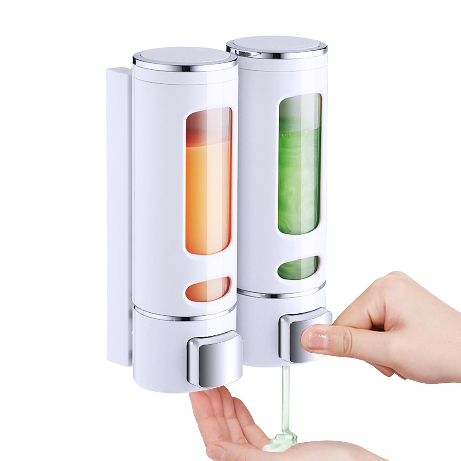White Soap Dispenser Wall-Mounted, 2 Chamber No-Drill Installation for Liquid Lotion, Shower Gel, Shampoo, Conditioner & Dish Detergent, 400ml Large