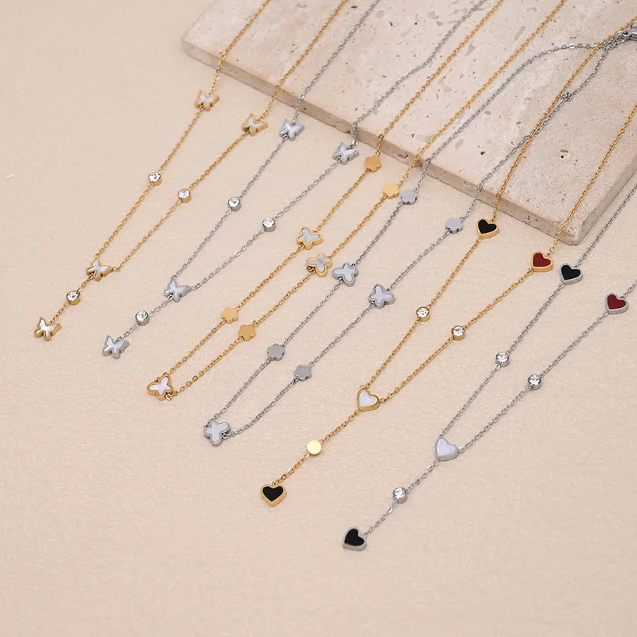 Wholesale Jewelry IG Style Sweet Red Heart Flower Butterfly 304 Stainless Steel Rhinestones Shell 18K Gold Plated Polishing cable chain Pendant Necklace